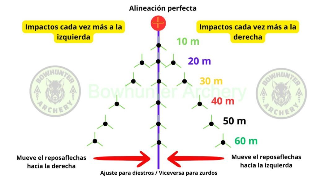 Lectura (diestros): deriva a la izquierda → mueve el reposaflechas a la derecha; deriva a la derecha → muévelo a la izquierda. Zurdos, al revés.