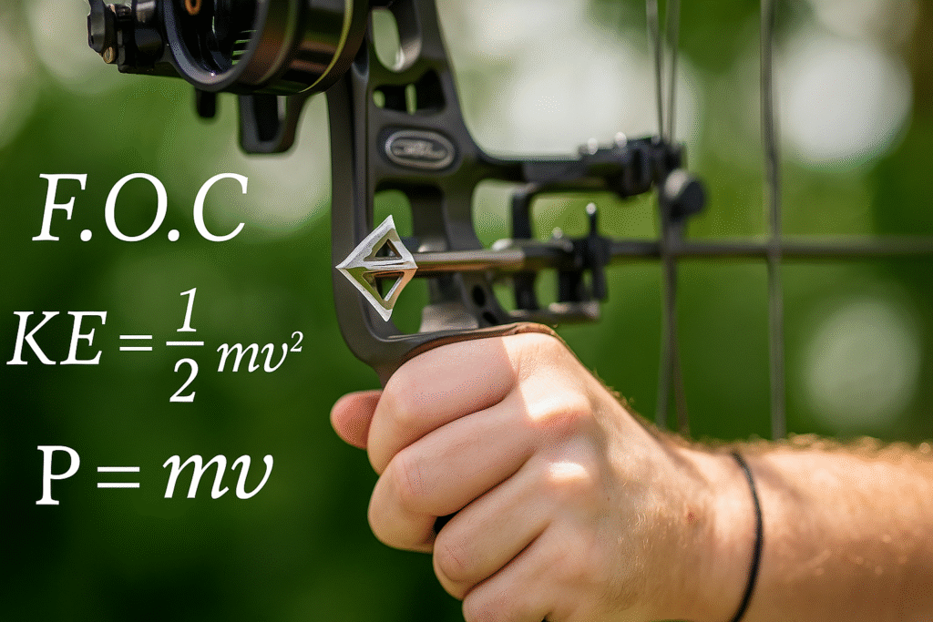 Claves: la velocidad pesa al cuadrado; masa suma lineal. Requiere spine correcto y puntas de caza bien alineadas.