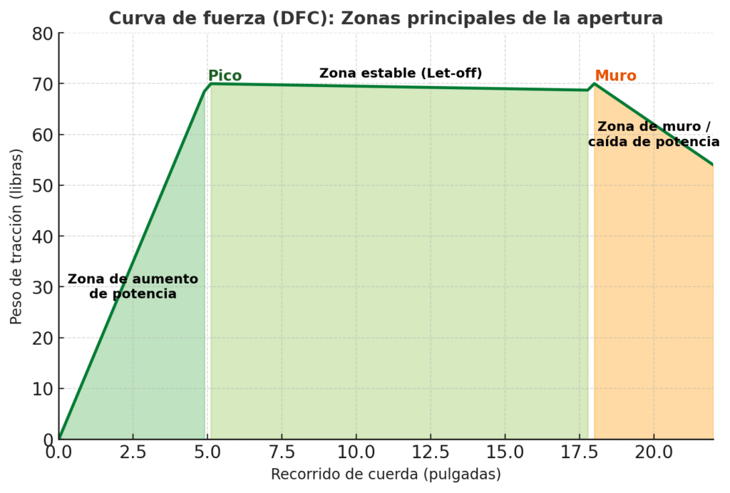 🟨 Zona estable (Let-off) → el arco mantiene potencia con menos esfuerzo.