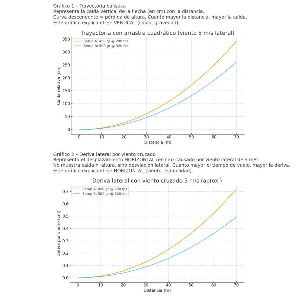 Masa de flecha: 420–550 gr como rango eficaz general; más pesada = más momento y silencio, menos velocidad.